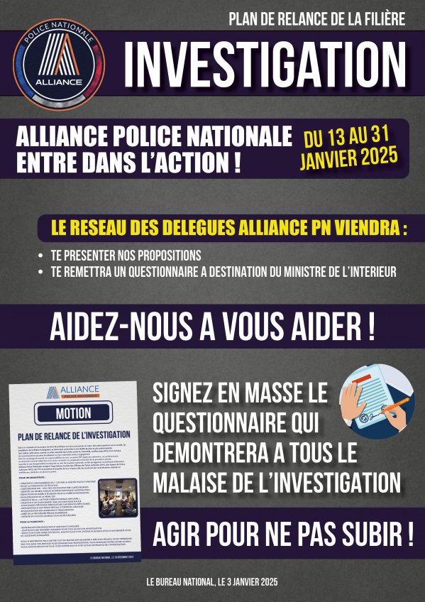 Plan de relance investigation Consultez une de nos 12 propositions Pour montrer votre exaspération, remplissez le questionnaire sur vos conditions de travail ! c’est votre colère qui donnera tout son sens à notre action Rapprochez vous de vos délégués Alliance Pn Publication : 13 janvier 2025 Lire la suite... Bureau National