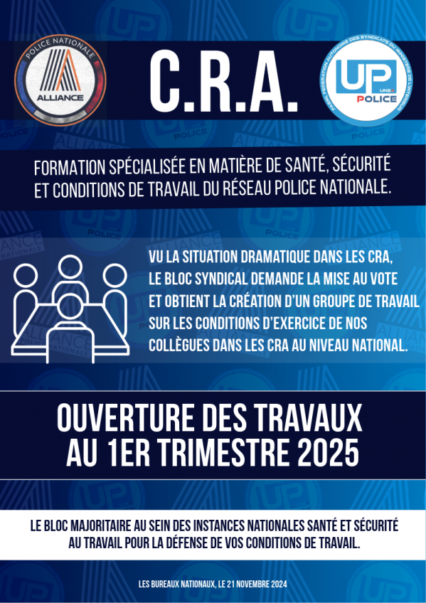 Face à la situation critique dans les Centres de Rétention Administrative (CRA), un groupe de travail national sur les conditions de travail des agents a été créé, avec un début prévu au 1er trimestre 2025.